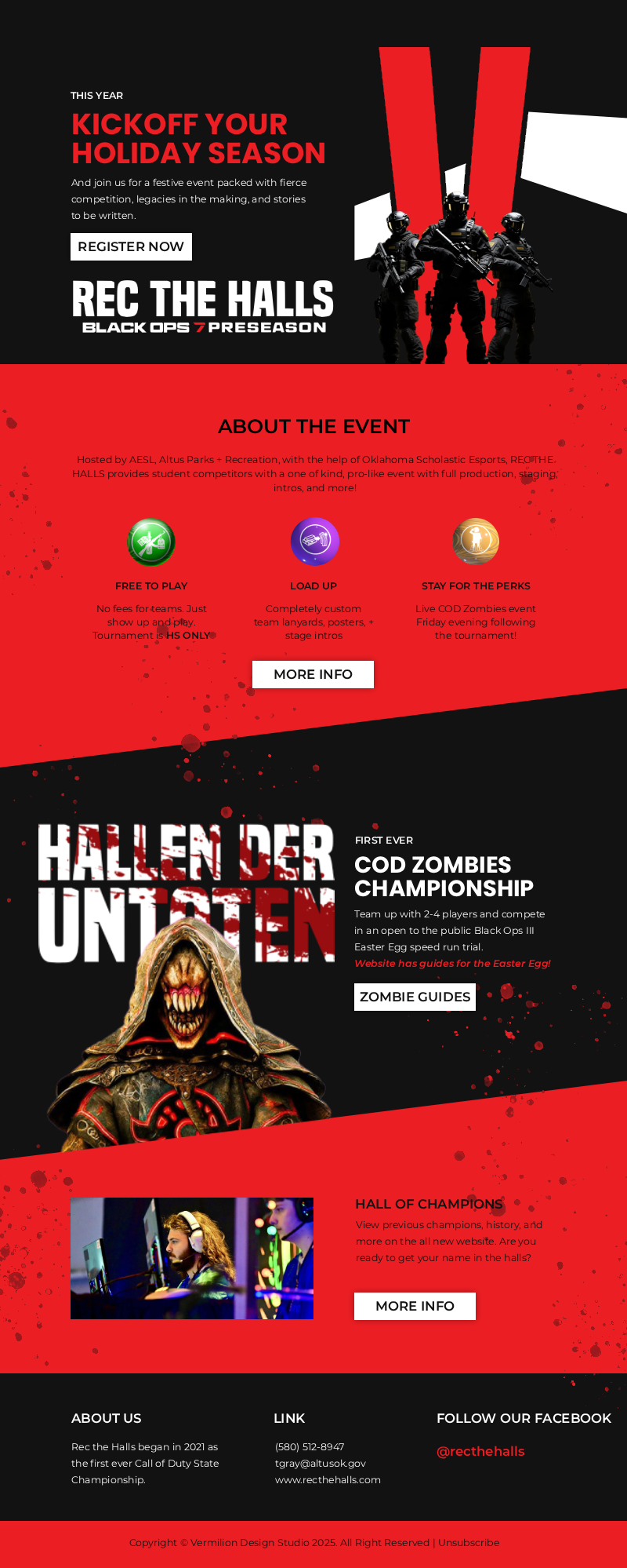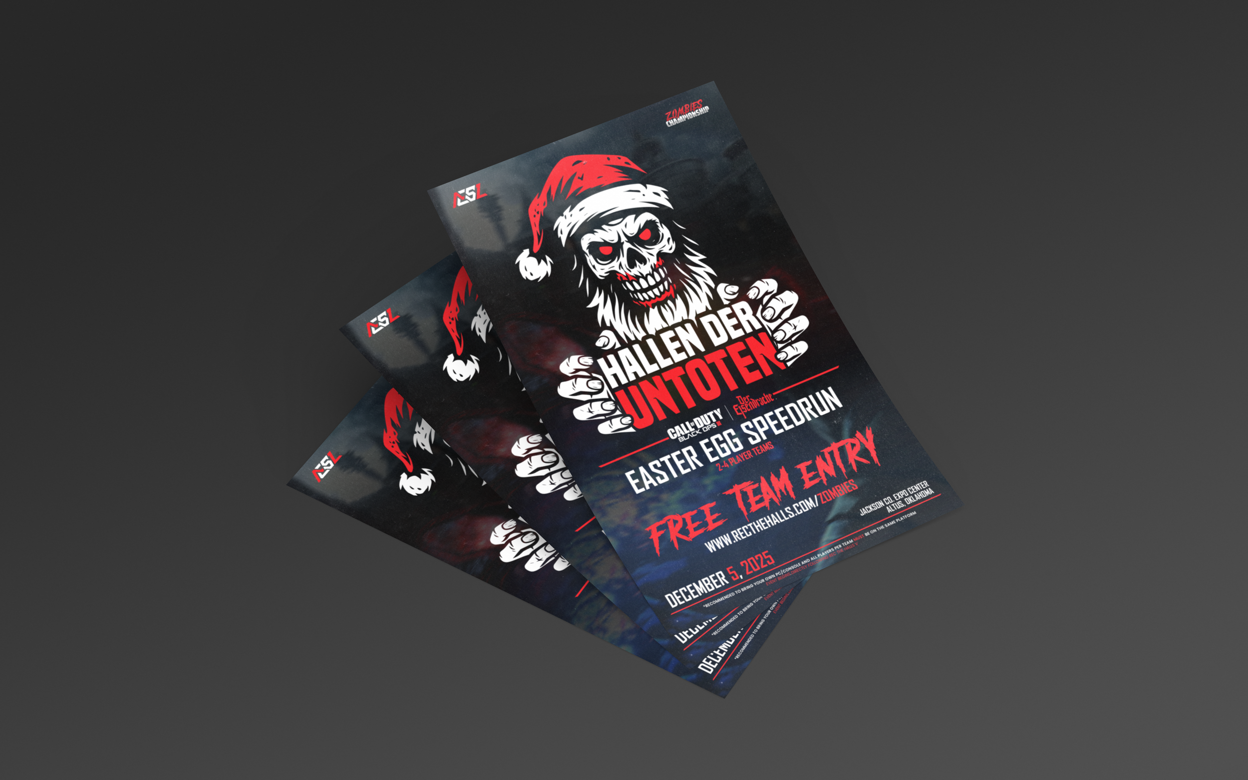 BY ADDING IN ANOTHER EVENT ON THE TAIL END OF THE SECOND NIGHT OF REC THE HALLS THIS YEAR, IT CALLED FOR ANOTHER LOGO TO BE CREATED. WE ARE HOSTING THE FIRST CALL OF DUTY ZOMBIES CHAMPIONSHIP IN OKLAHOMA FOLLOWING PRE-SEASON TOURNAMENT FOR BLACK OPS 7. THE EVENT IS CALLED “HALLEN DER UNTOTEN” WHICH IS GERMAN FOR “HALLS OF THE UNDEAD”. MAPS IN CALL OF DUTY ZOMBIES SOMETIMES ARE IN GERMAN, WHICH IS WHERE OUR NAME FOR THIS EVENT CAME FROM. THIS LOGO, WHILE SOMEWHAT SINISTER, EMBODIES THE COD ZOMBIES COMMUNITIES FEEL AND STYLE.